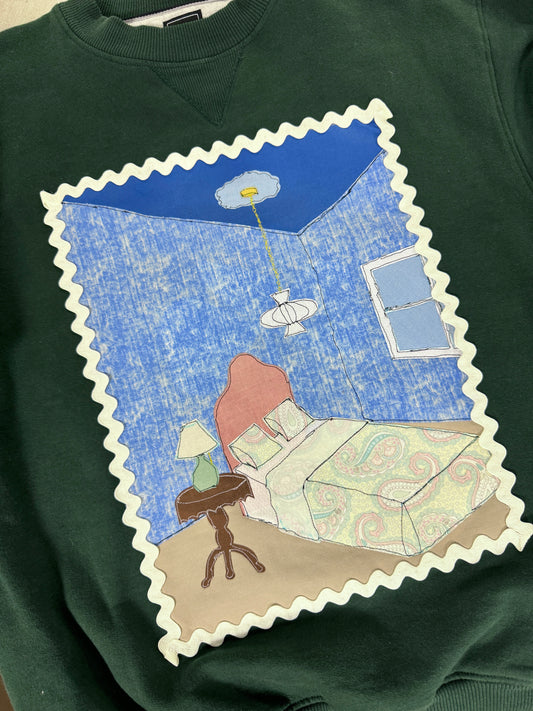 upcycled scrap sweatshirt - bedroom vignette