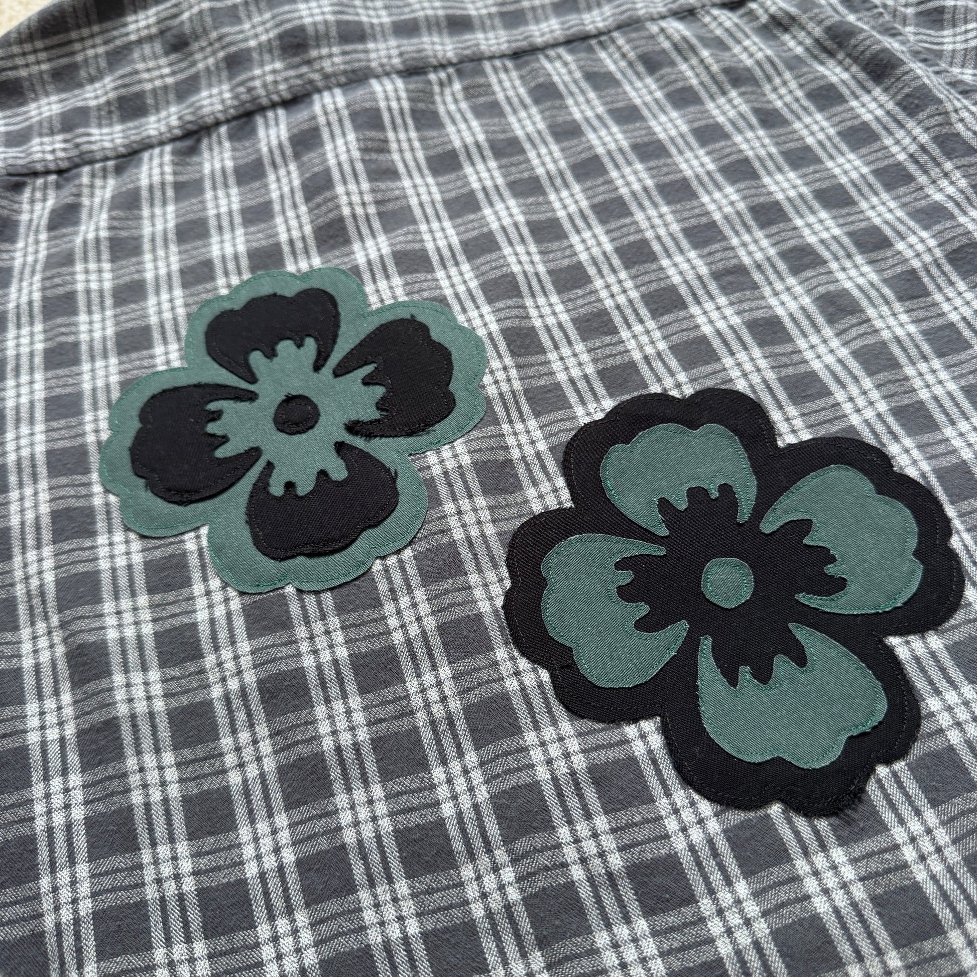 Hand wash cold and lay flat or hang to dry to preserve the appliqué and raw-edge finish.