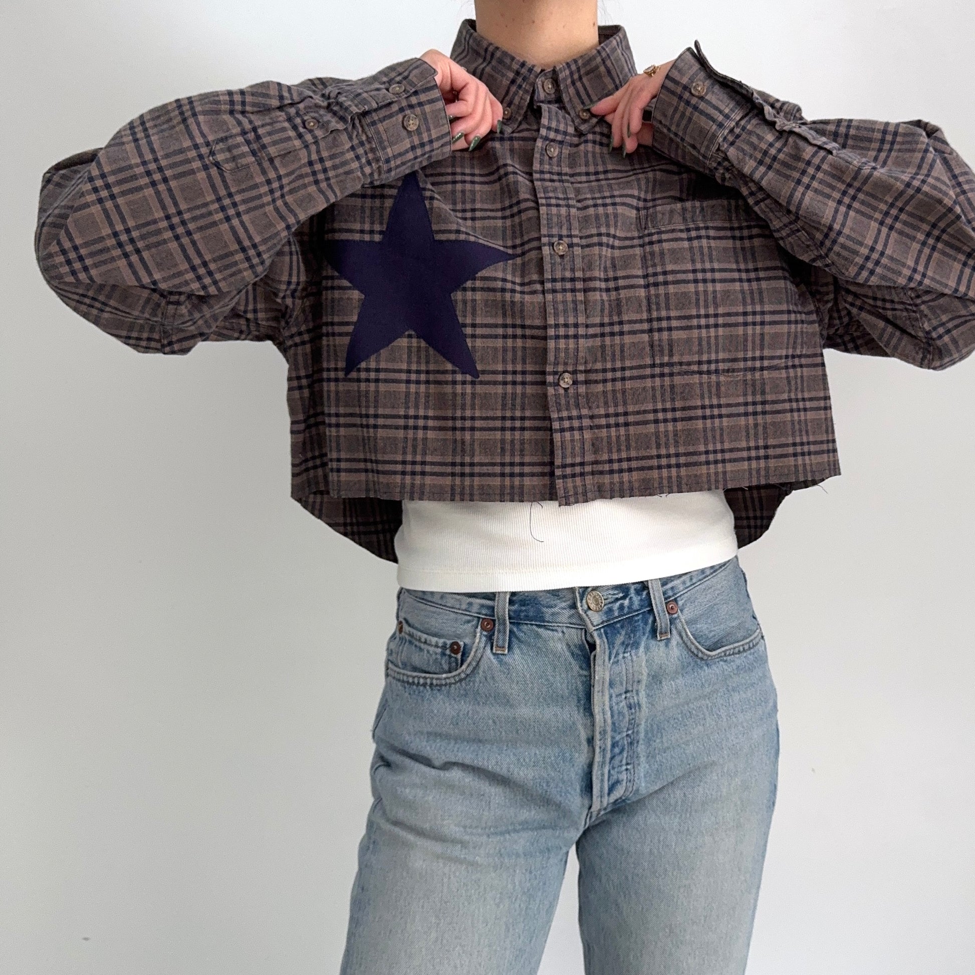 Secondhand button-down shirt reworked into a cropped silhouette with a reshaped rounded hem. Finished with graphic appliqué elements constructed from reclaimed fabric, including a bold star at the front and three hearts across the back yoke. One-of-a-kind.